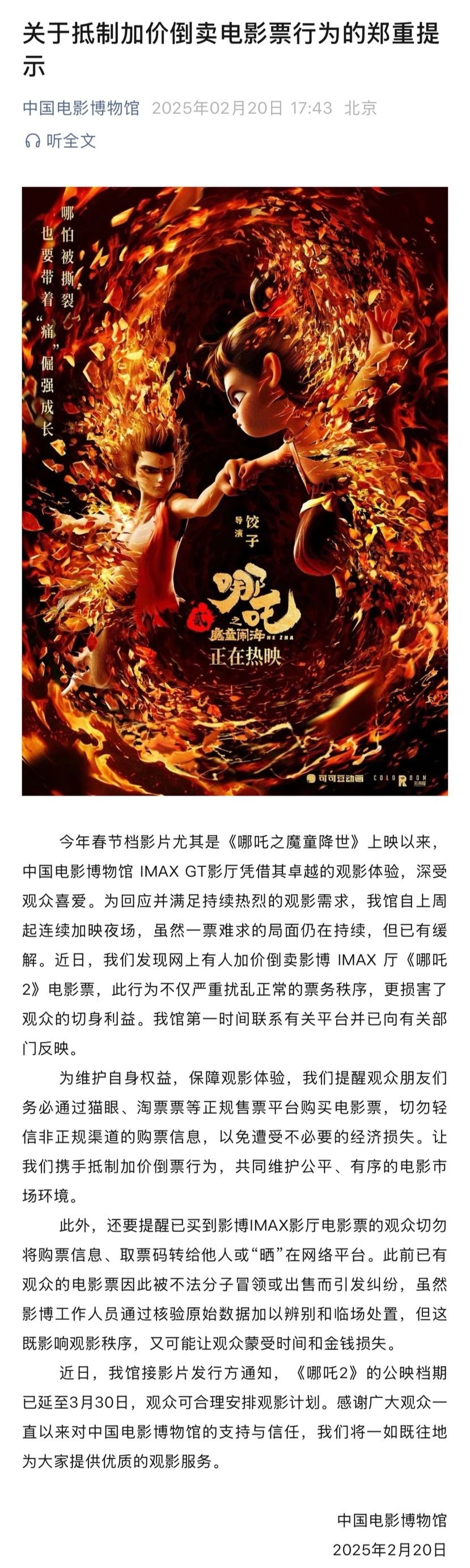提示中写到:为回应并满足持续热烈的观影需求,中国电影博物馆自上周起连续加映夜场,虽然一票难求的局面仍在持续,但已有缓解。近日,网上有人加价倒卖影博 IMAX 厅《哪吒2》电影票,此行为不仅严重扰乱正常的票务秩序,更损害了观众的切身利益。中国电影博物馆第一时间联系有关平台并已向有关部门反映。