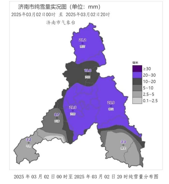 纯雪量(毫米):市区29.3、长清区8.7、济阳区19.8、商河县21.2、章丘区26.9、莱芜区3.3、平阴县3.2。