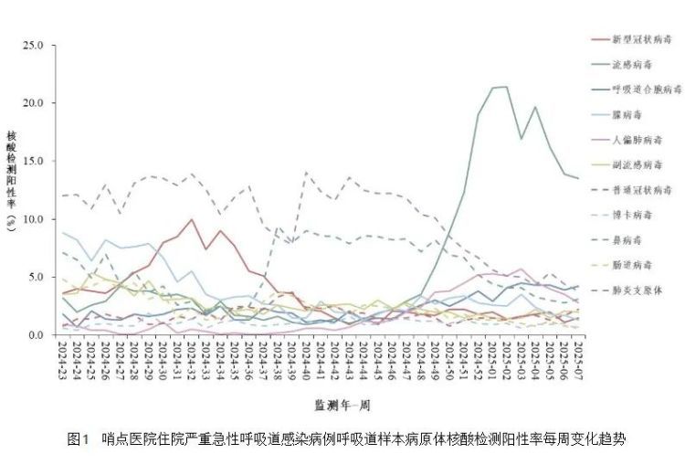 根据中国疾病预防控制中心发布的《全国急性呼吸道传染病哨点监测情况(2025年第7周)数据显示,住院严重急性呼吸道感染病例的呼吸道样本检测阳性病原体主要为流感病毒、呼吸道合胞病毒、肺炎支原体(图1),5~14岁年龄组中住院严重急性呼吸道感染病例中肺炎支原体核酸检测阳性率排第一位,5~14岁学龄儿童是肺炎支原体感染主要人群,需引起家长重视。
