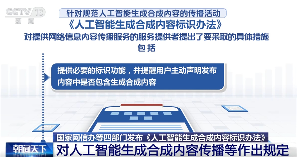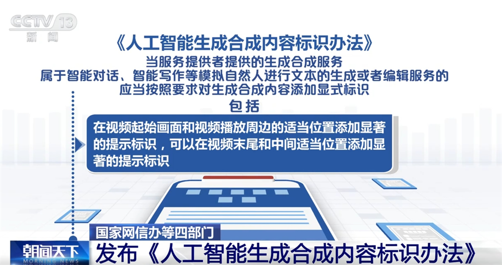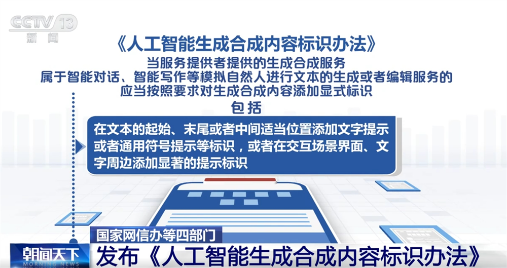央视网消息:记者14日从国家网信办获悉,为了促进人工智能健康发展,规范人工智能生成合成内容标识,国家网信办、工业和信息化部、公安部、国家广播电视总局制定了《人工智能生成合成内容标识办法》。《标识办法》将于2025年9月1日起施行。