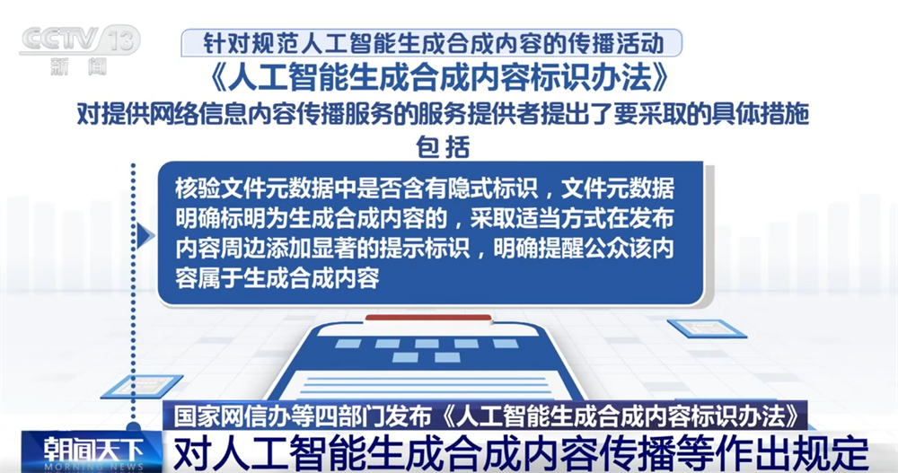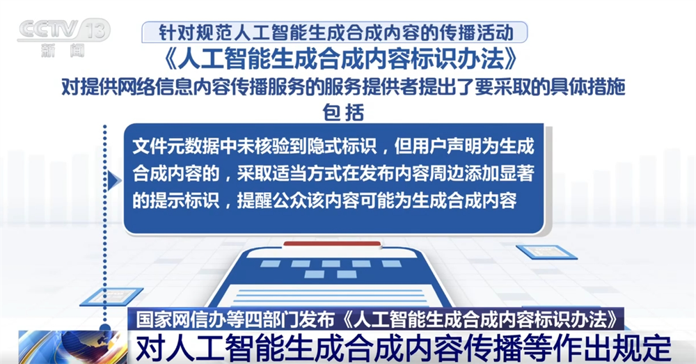另外还要求,服务提供者应当采取技术措施添加不影响用户使用的标识,在生成合成内容的文件元数据中添加隐式标识,隐式标识包含生成合成内容属性信息、服务提供者名称或者编码、内容编号等制作要素信息。