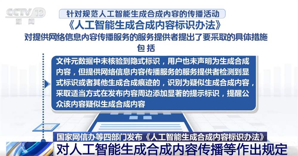 针对规范人工智能生成合成内容的传播活动,《标识办法》对提供网络信息内容传播服务的服务提供者提出了要采取的具体措施,包括: