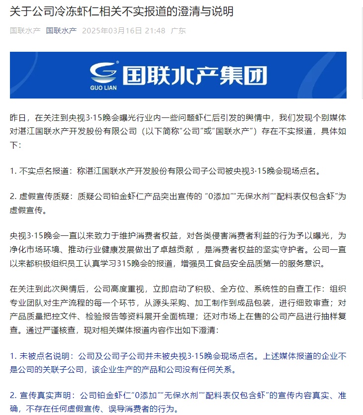 针对央视3·15晚会曝光广东湛江“保水虾仁”问题,3月16日晚间,湛江国联水产开发股份有限公司发布澄清公告。国联水产方面表示,公司及公司子公司不存在被央视315晚会现场点名的情况,公司铂金虾仁“0添加”“无保水剂”“配料表仅包含虾”的宣传真实、准确,不存在虚假宣传、误导消费者的行为,目前该产品在电商平台继续销售。