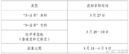 广东省教育考试院17日发布2025年春季高考招生录取工作日程表。其中,“3+证书”本科投档录取时间为3月27日;“3+证书”专科、依学考录取(普通类和艺体类)为3月28日—30日。