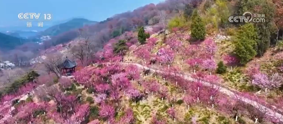 在连云港花果山,23000多株梅花灼灼盛放,粉红相间,如霞似锦。慕名前来的游人徜徉花海,拍照留念,感受春的气息。