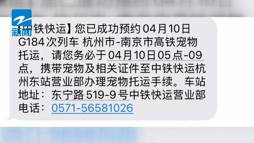 上午,记者来到中铁快运杭州东站营业点,刘女士是杭州第一个带着爱犬柯基小乖来托运的,刘女士告诉我们,自己是两天前在社交平台刷到可以带宠物坐高铁的消息,第一时间就给自己的小狗下了单,准备去南京。“小狗去南京是360块,我是4月8号凌晨下单的,流程还是挺顺利的,跟人买票差不多。选好班次,把它的照片和信息上传,就可以下单了,加上买票的时间差不多三分钟。”