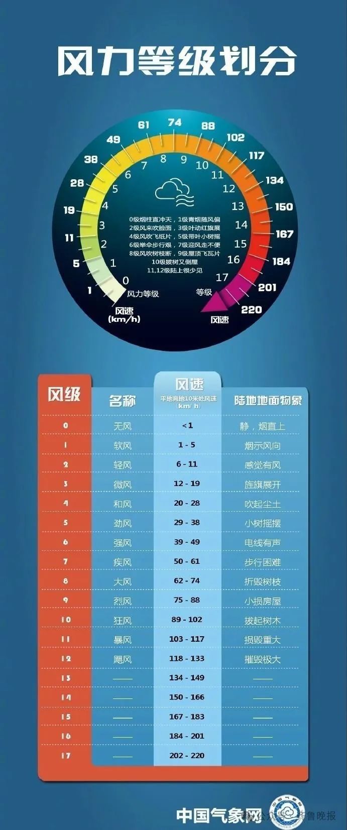 这场大风威力有多大?阵风7级以上就会对人民生产生活产生较大负面影响;当阵风达到9级时,户外行走非常困难。13级阵风可以吹断直径达30厘米左右的树木。