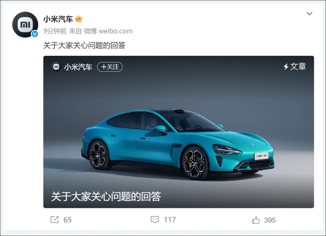 4月11日下午,@小米汽车微博发文《关于大家关心问题的回答》,回应此次车祸: