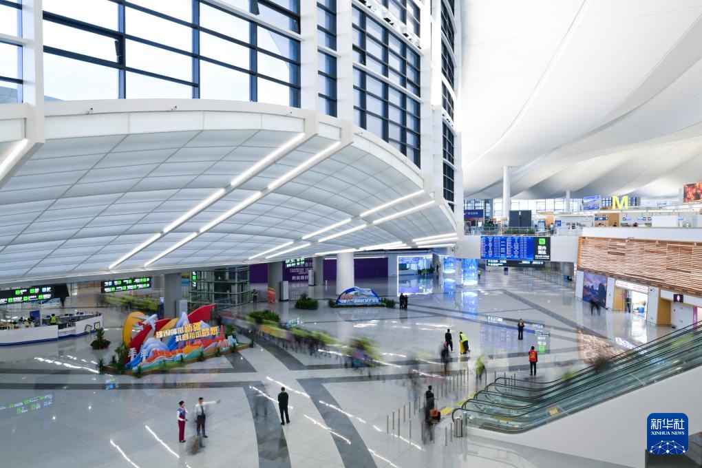 4月17日,人们走在乌鲁木齐天山国际机场北区航站楼内。