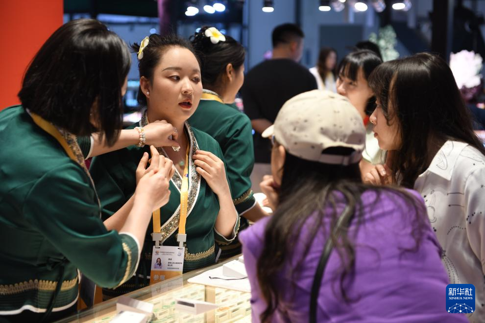 4月16日,工作人员在第五届消博会七彩云南翡翠展台为参观者示范和讲解展品。