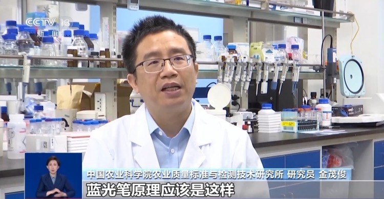 中国农业科学院农业质量标准与检测技术研究所研究员 金茂俊:蓝光笔原理应该是这样,波有很多波长,比如像紫外光,它是在200~380纳米左右,像蓝光大概在460~500纳米左右,所以蓝光笔在460~500纳米的波长波,去激发一个物质,它就会产生荧光。