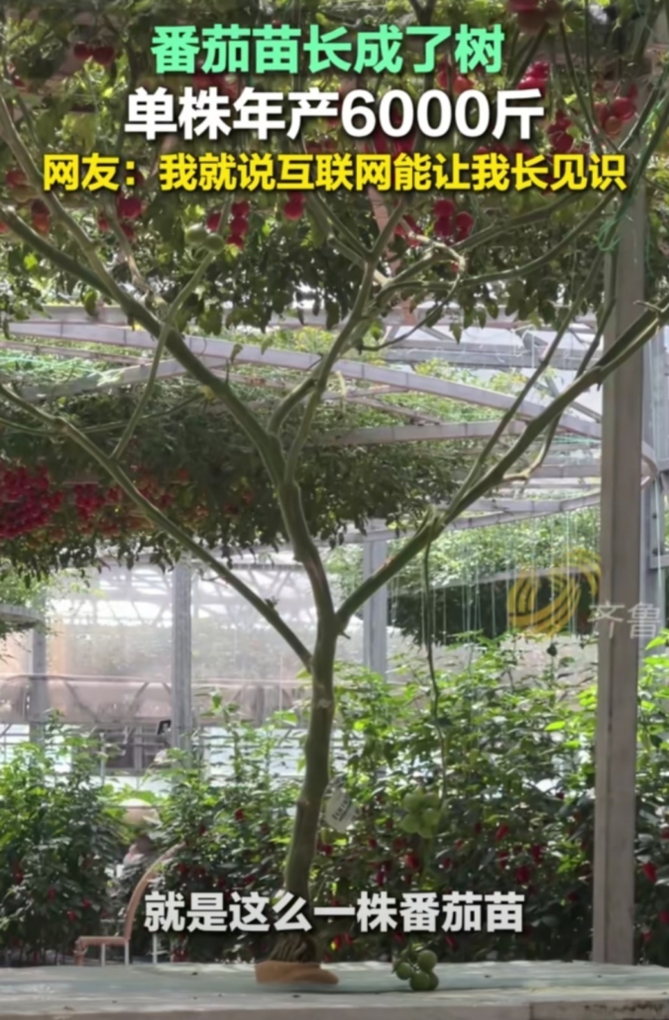 据中国山东网2024年报道,在潍坊寿光,有一株体态庞大的“番茄树”,植株高2米多,树冠覆盖面积150多平方米,树上有成百上千个生长点,树上挂满了大大小小的番茄。“这株番茄树用的是常规优质蔬菜种,通过后期整枝修剪、营养调控和环境调控技术,使番茄植株长为树状,故称之为‘番茄树’。”