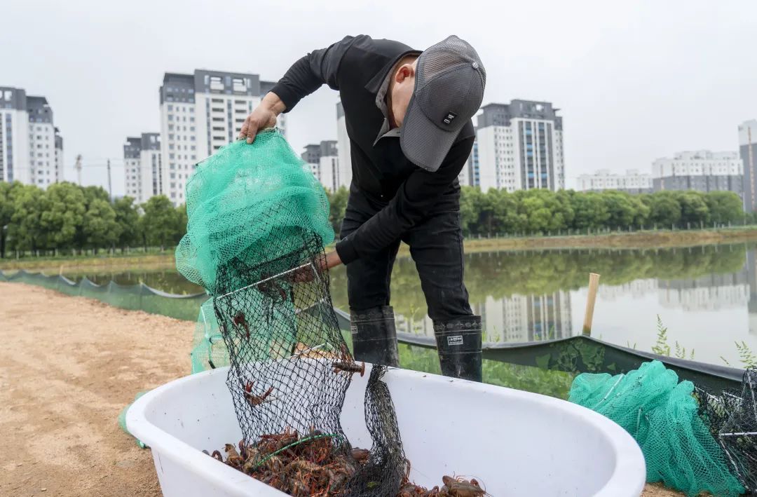 4月24日,庐江县汤池镇双墩村,养殖户正捕捞小龙虾