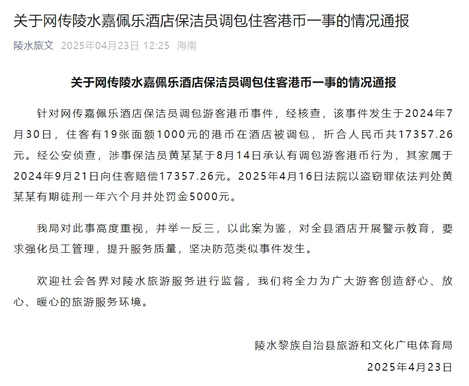 4月23日,陵水黎族自治县旅游和文化广电体育局就“嘉佩乐酒店保洁员调包住客港币”一事发布情况通报称: