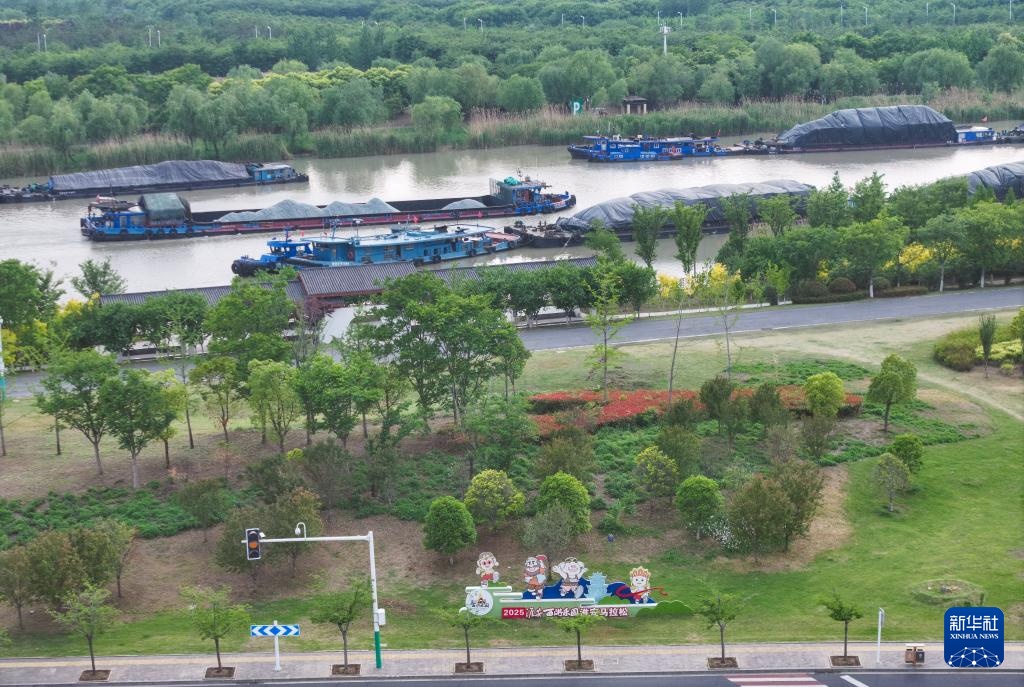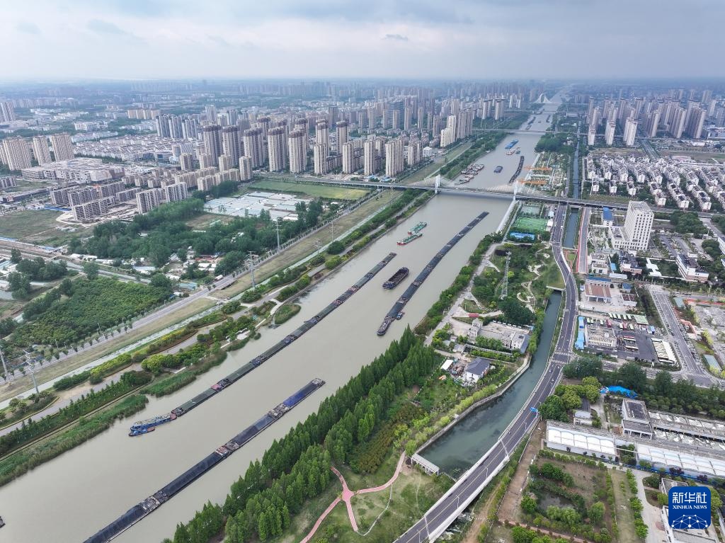 船只行驶在京杭大运河淮安段(5月10日摄,无人机照片)。