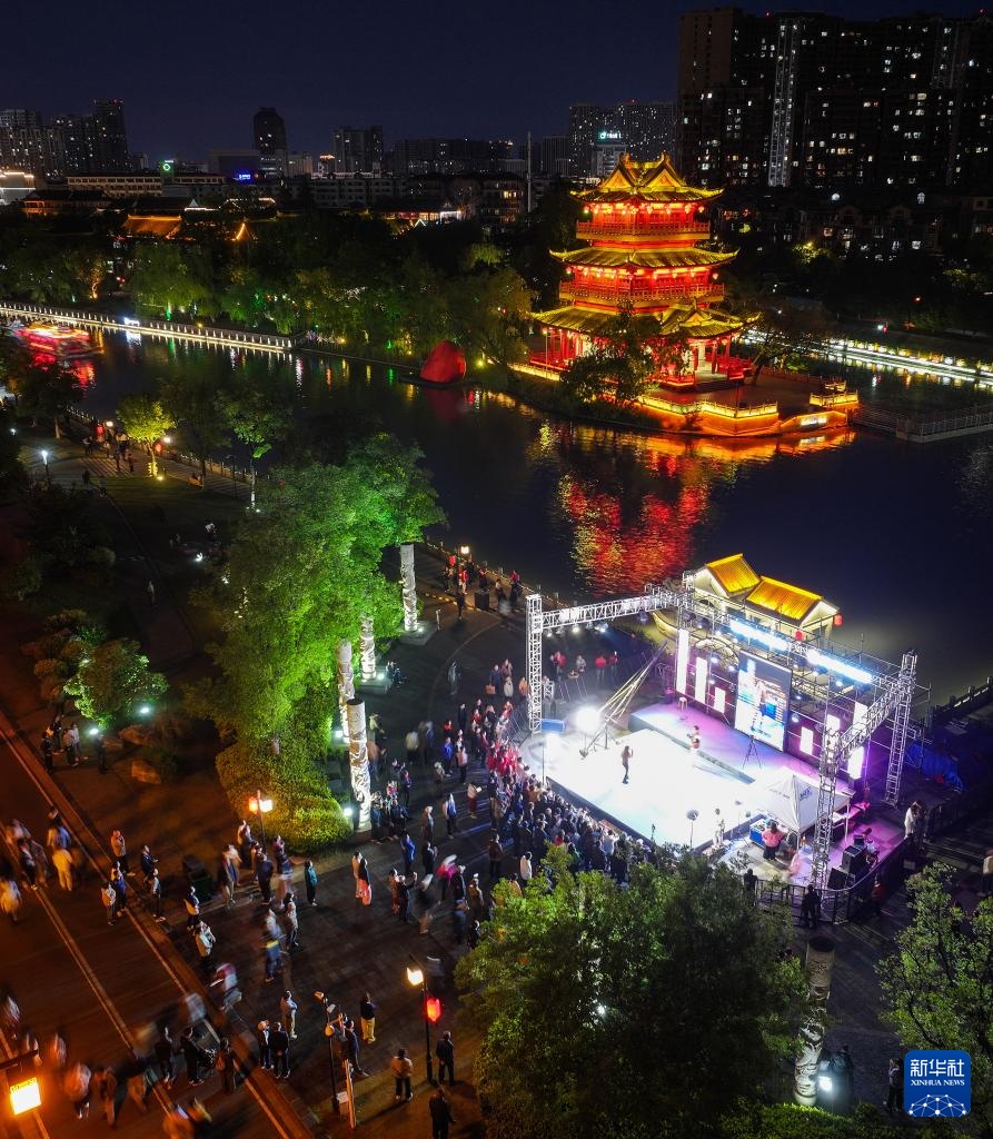 市民和游人在淮安里运河文化长廊观看表演(5月10日摄,无人机照片)。