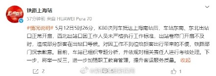 @铁路上海站 发布情况说明,5月12日5时26分,K80次列车抵达上海南站后,车站东南、东北出站口正常开启,西北出站口因工作人员未严格执行工作标准,出站卷帘门开启不及时,造成部分旅客在出站口等候。对因工作不到位给旅客出行带来的不便,铁路部门深表歉意。目前,车站已组织专题分析,并依规对相关责任人进行考核处理。下一步,将举一反三,进一步加强职工教育管理,提升客运服务质量。