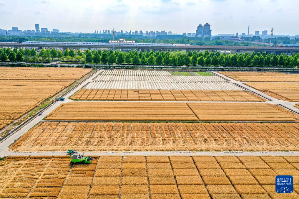 5月20日,在江苏里下河地区农科所(扬州市农科院)试验田,农民驾驶收割机收割小麦(无人机照片)。