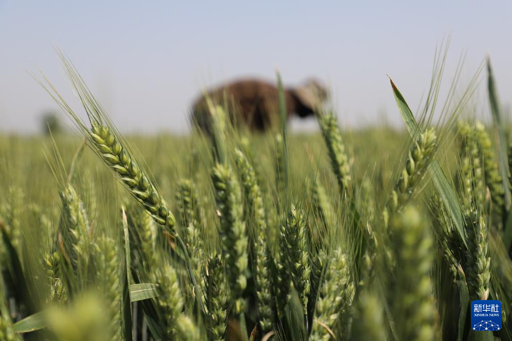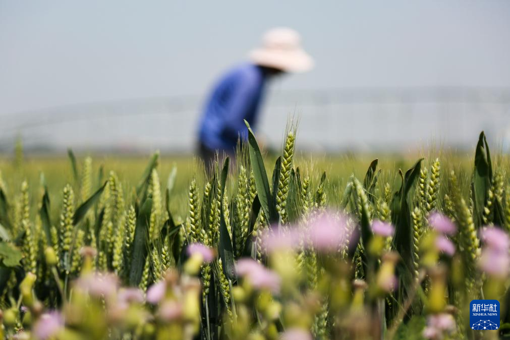 5月20日,在山东省滨州市沾化区冯家镇范庄村,农户在麦田里查看小麦长势 新华社发(贾海宁摄)
