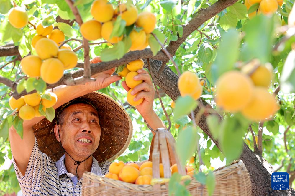 5月20日,山东省枣庄市市中区齐村镇凤凰岭村农民在果园采摘鲜杏。 新华社发(孙中喆摄)