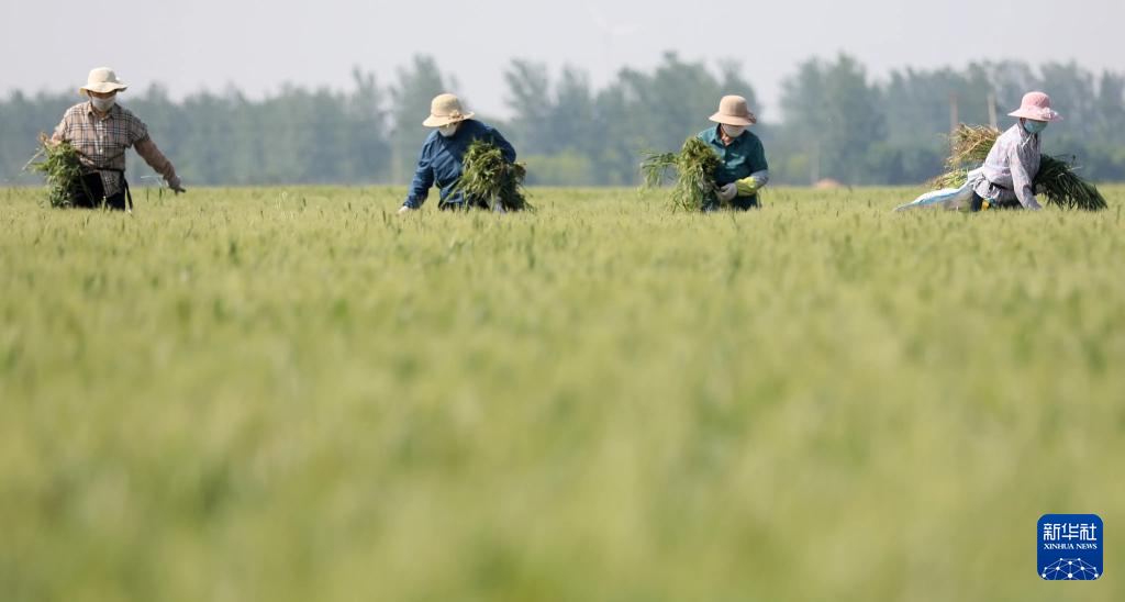 5月20日,农民在山东省东营市广饶县李鹊镇苏家村的麦田里拔草。 新华社发(刘云杰摄)