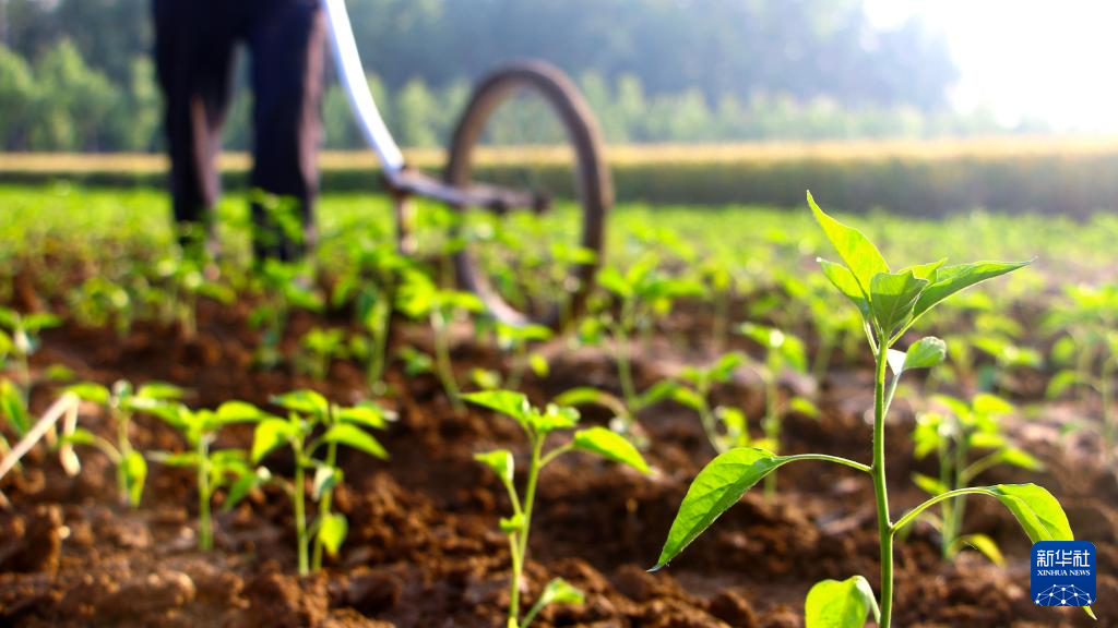 5月20日,河南省商丘市柘城县陈青集镇农民在田间给辣椒苗松土。 新华社发(张子斌摄)