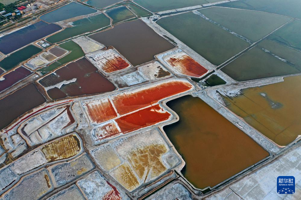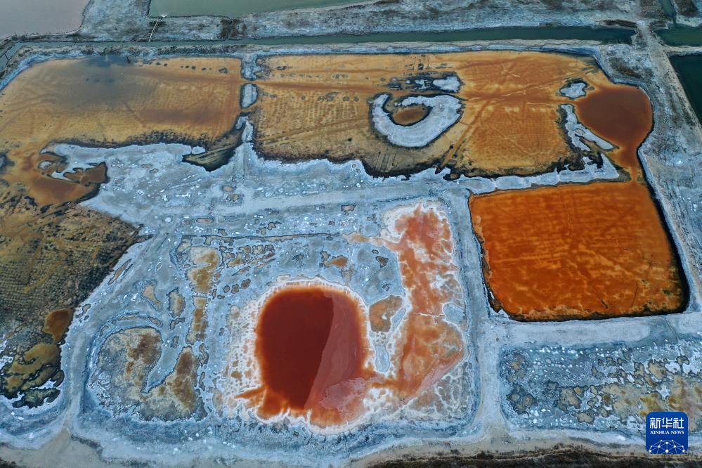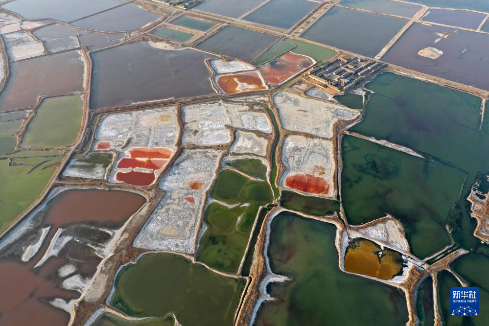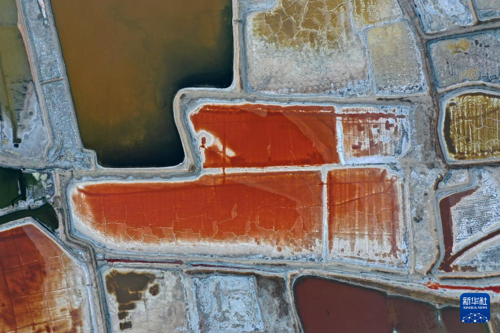 连日来,随着气温持续升高,位于山西南部的运城盐湖呈现出色彩斑斓的景象,从空中俯瞰,如同一块块散落在大地上的调色盘。