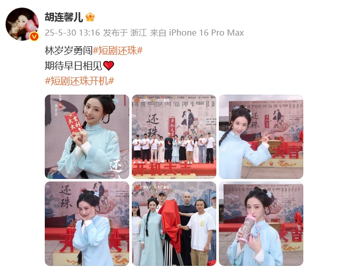 胡连馨晒出多张开机现场照写道:“林岁岁勇闯短剧《还珠》,期待早日相见。”