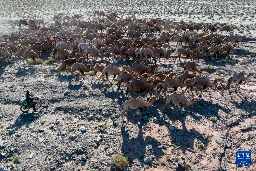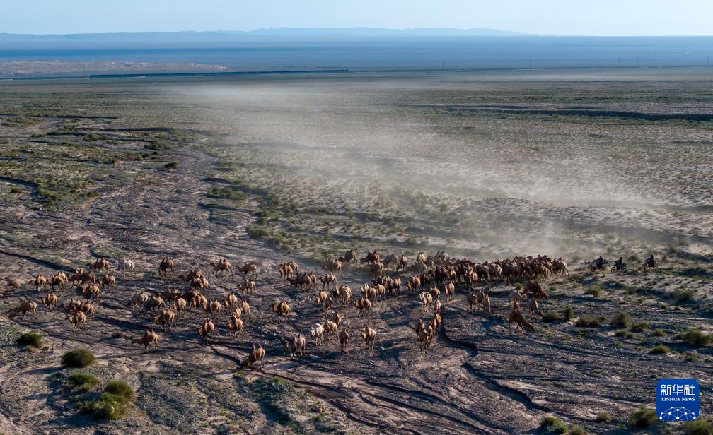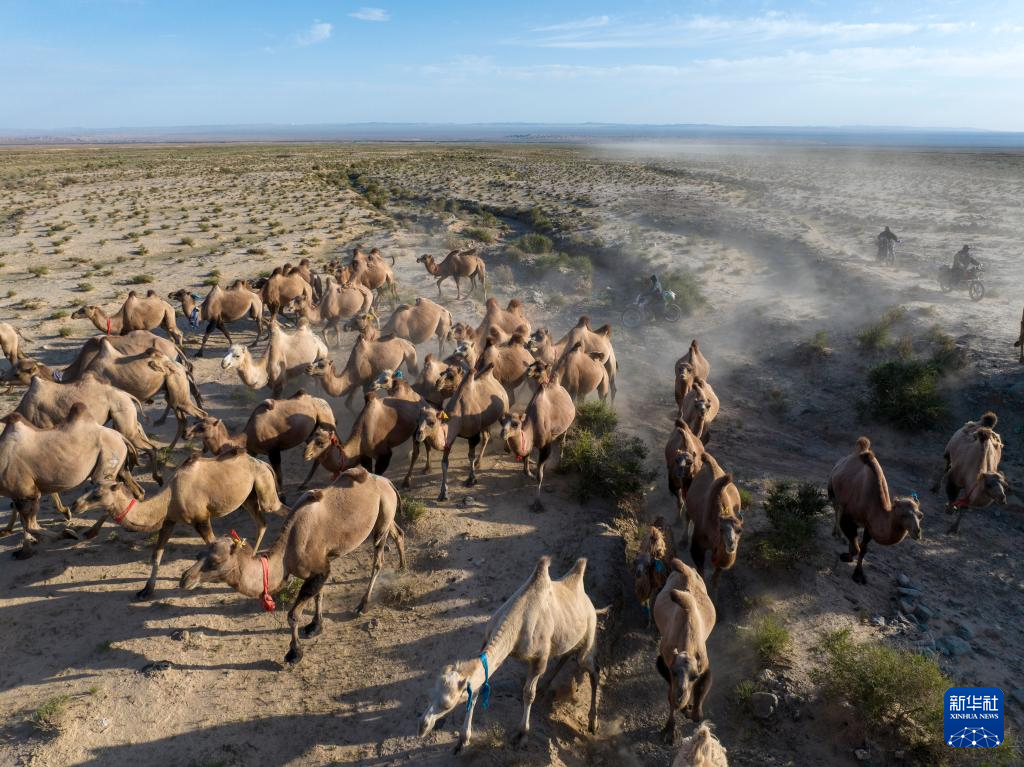 夏日里,甘肃省阿克塞哈萨克族自治县红柳湾镇加尔乌宗村牧民们赶着骆驼,从戈壁滩春季牧场转场到祁连山区的夏季牧场,让骆驼更好生长的同时也让牧场环境得到休养生息。