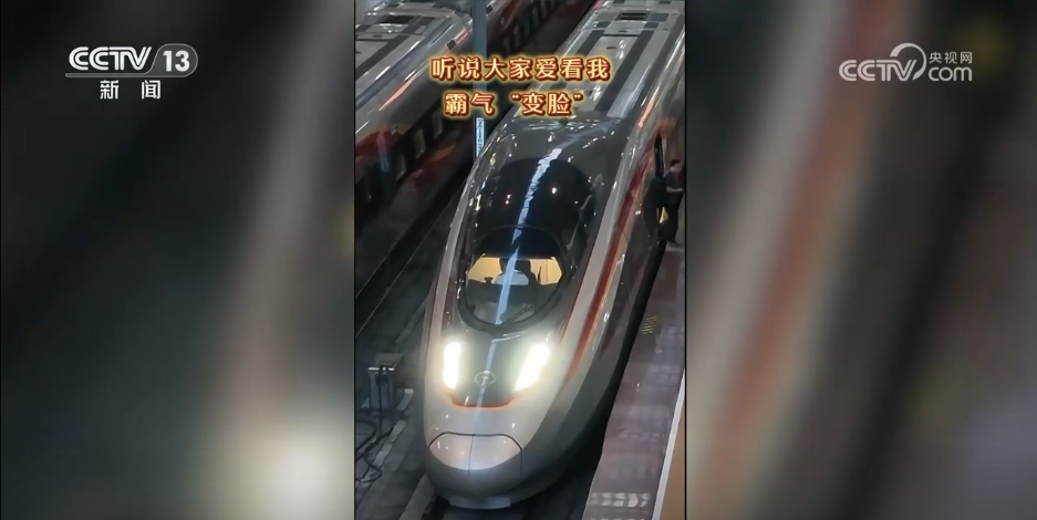 在国铁武汉局武汉站,G1102次高铁列车刚到站停稳不久,车头上像两个眼睛一样亮着的白色灯光,突然变成了红色,瞬间“变脸”吸引了旅客。