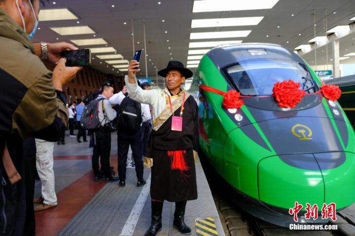 资料图:民众在拉萨火车站复兴号车头前拍照留念。 中新社记者江飞波 摄