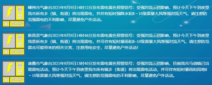 绍兴嵊州、诸暨、新昌发布雷电黄色预警