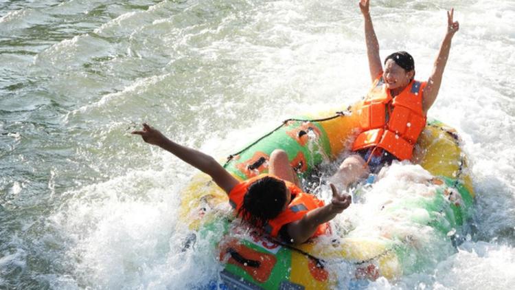 在四川省达州市渠县賨人谷景区,游客在漂流。新华社发(邓良奎摄)