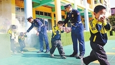 11月4日,在江苏省连云港市连云区南巷社区,小朋友在消防员指导下参与火灾逃生演练,学习消防安全知识,掌握火灾逃生技能。朱华南 摄