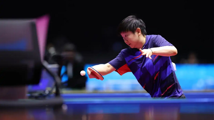 11月10日,在全运会乒乓球女子单打1/16决赛中,河北队选手孙颖莎以4比0战胜天津队选手刘炜珊,晋级下一轮。光明日报记者 朱晓帆摄/光明图片