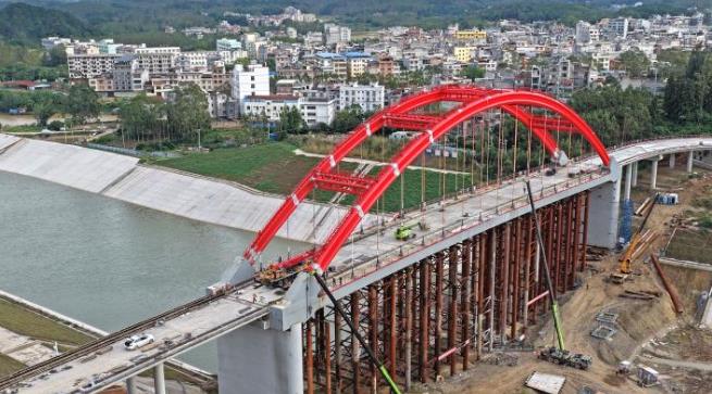 这是11月11日拍摄的广西平陆运河上一座即将完工的过江通道桥(无人机照片)。
