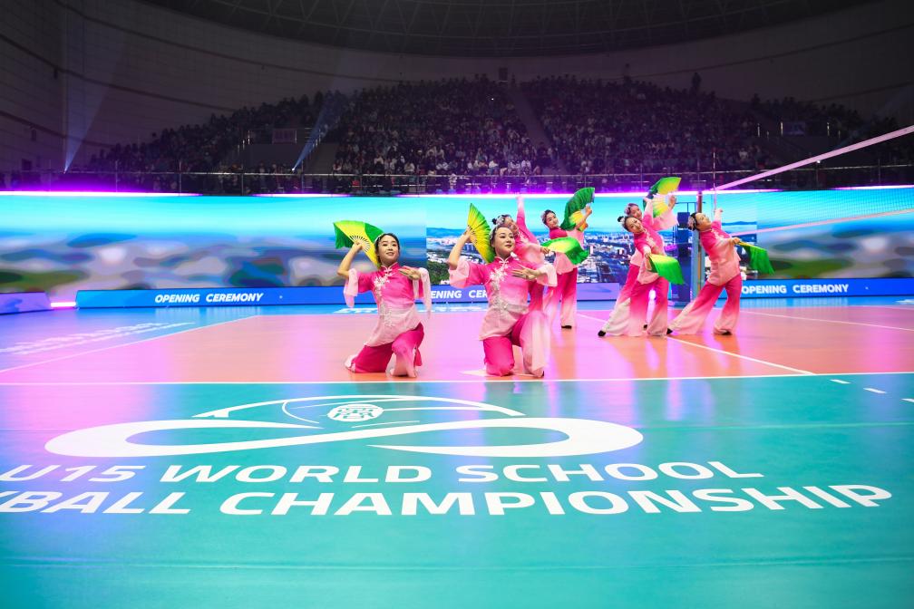 12月5日,2025年U15世界中学生排球锦标赛在陕西商洛开赛。图为演员在开幕式上表演。新华社记者 邹竞一 摄