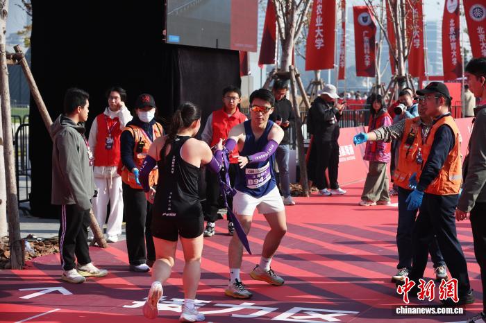 12月7日,运动员在接力赛中交接棒。当日,2025高校百英里接力赛总决赛在上海举行。本次比赛吸引了全国7大赛区及城市分站赛脱颖而出的顶尖高校赛队及特邀、外卡赛队共计100支队伍、近1300名青年运动员参赛。总决赛延续传统长距离团体接力赛制,总距离达到160公里。中新社记者汤彦俊 摄