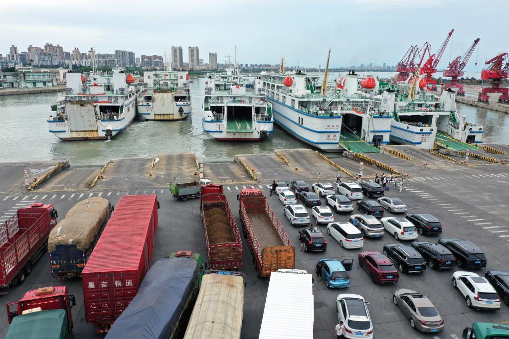 在海南省海口市秀英港,客滚船在装卸乘客、车辆(无人机照片)。新华社记者 郭程 摄