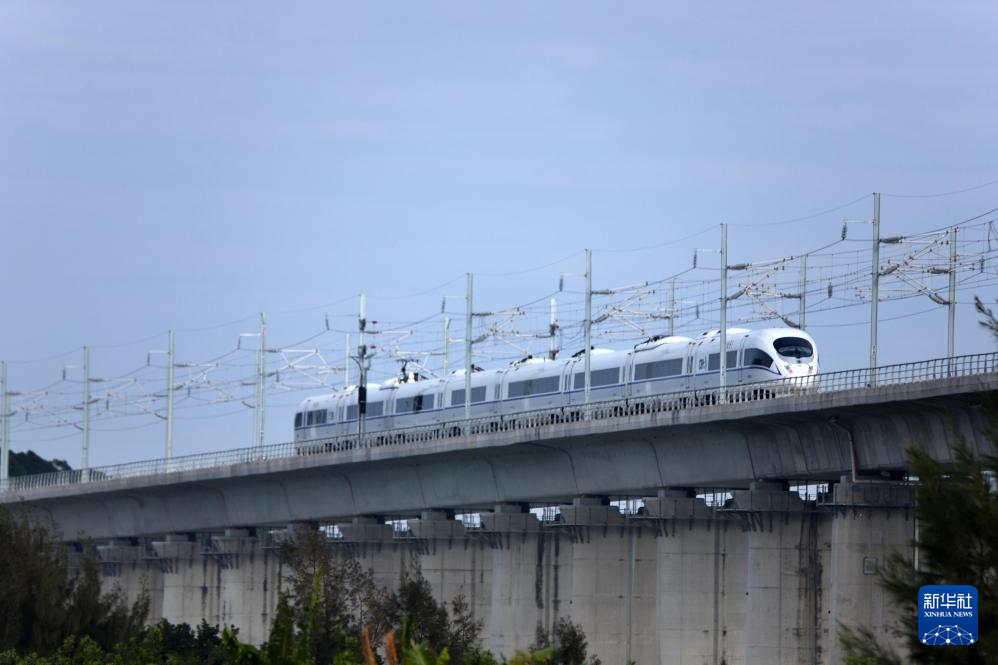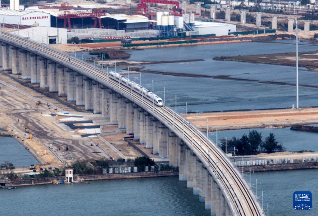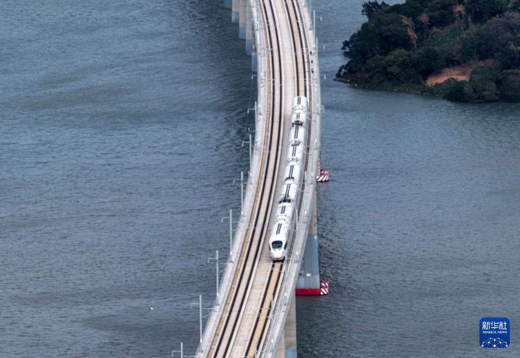 这是12月22日拍摄的行驶在汕头濠江特大桥上的高铁列车。 新华社发(姚军 摄)