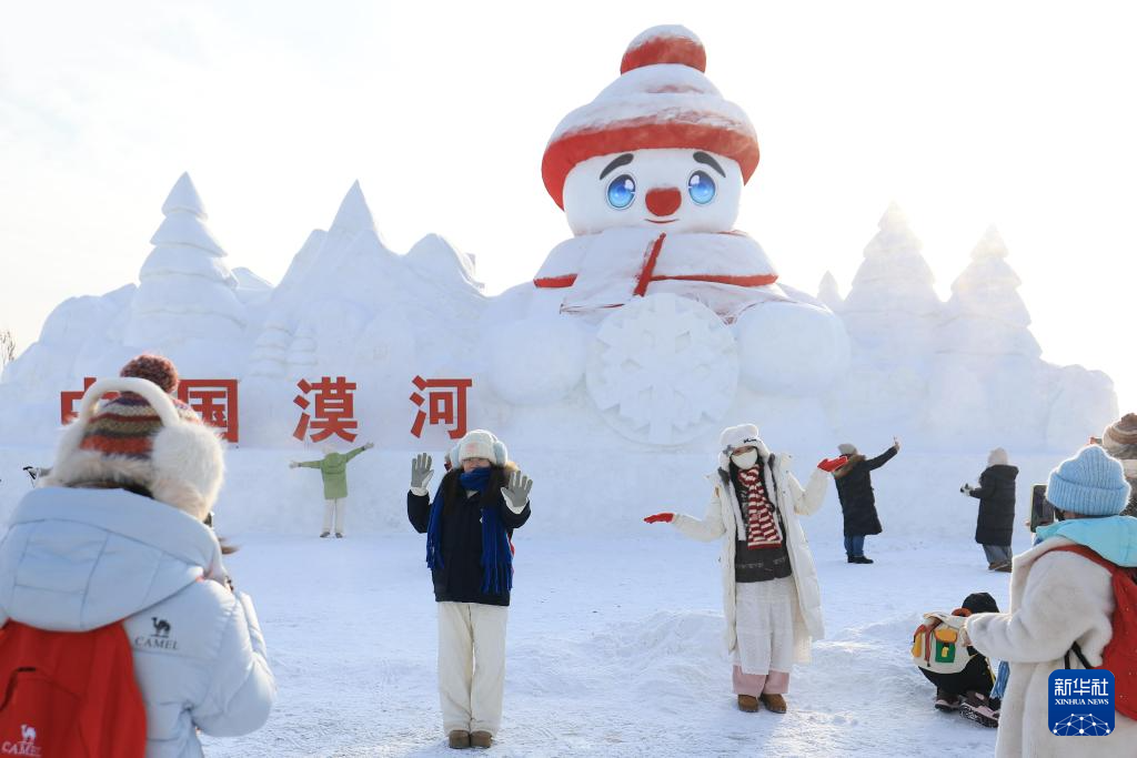 12月23日,游人在漠河站站前广场与“最北大雪人”合影。新华社发(徐率摄)