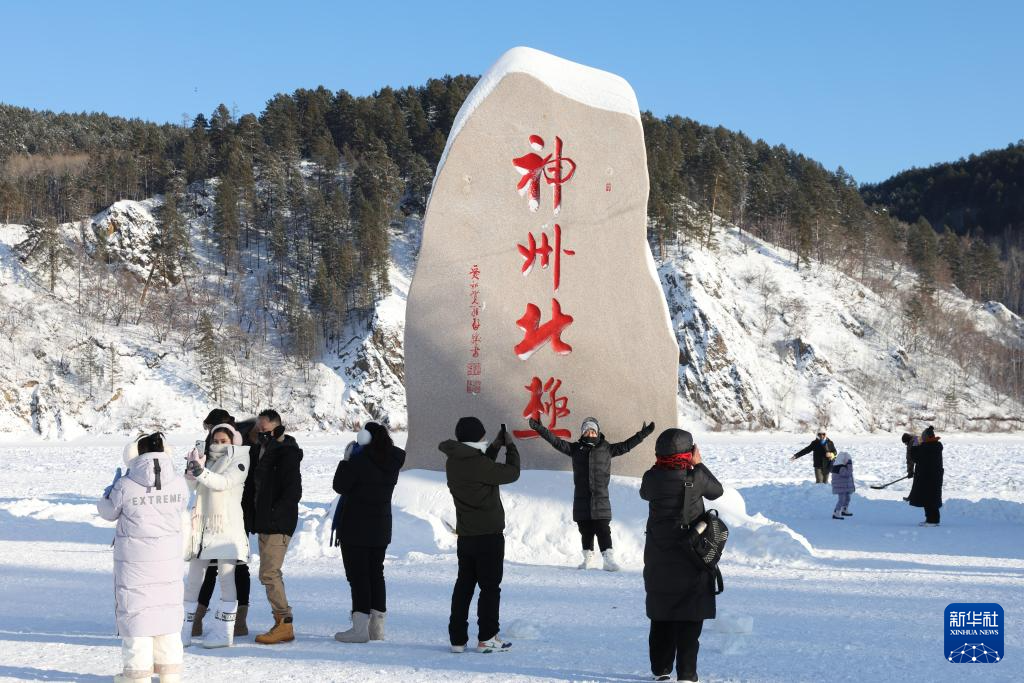 12月27日,游人在漠河市北极村神州北极广场拍照。新华社发(邵天李摄)