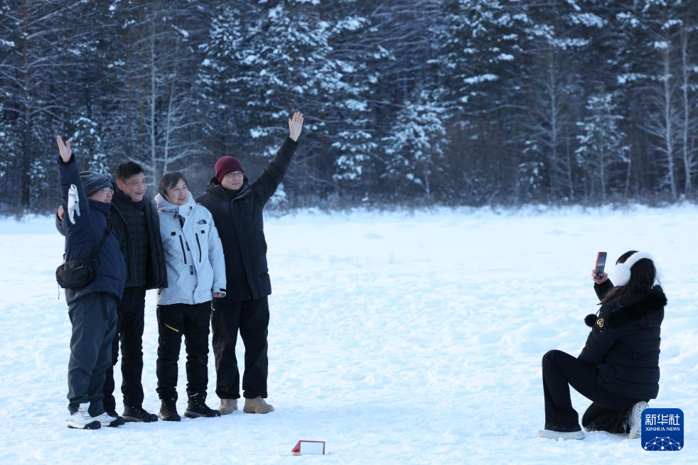 12月27日,游人在漠河市北极村留影。新华社发(邵天李摄)