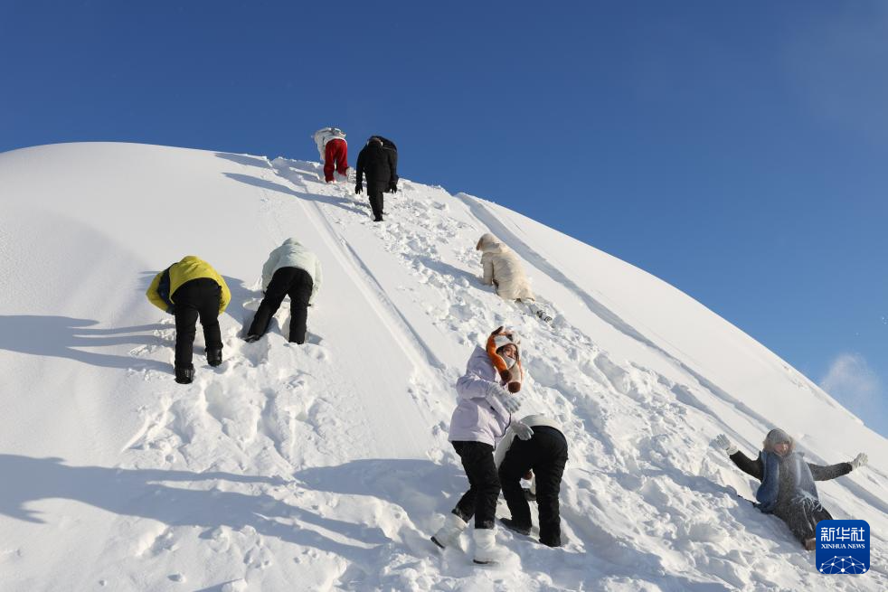 12月27日,游人在漠河市北极村攀爬雪坡。新华社发(邵天李摄)