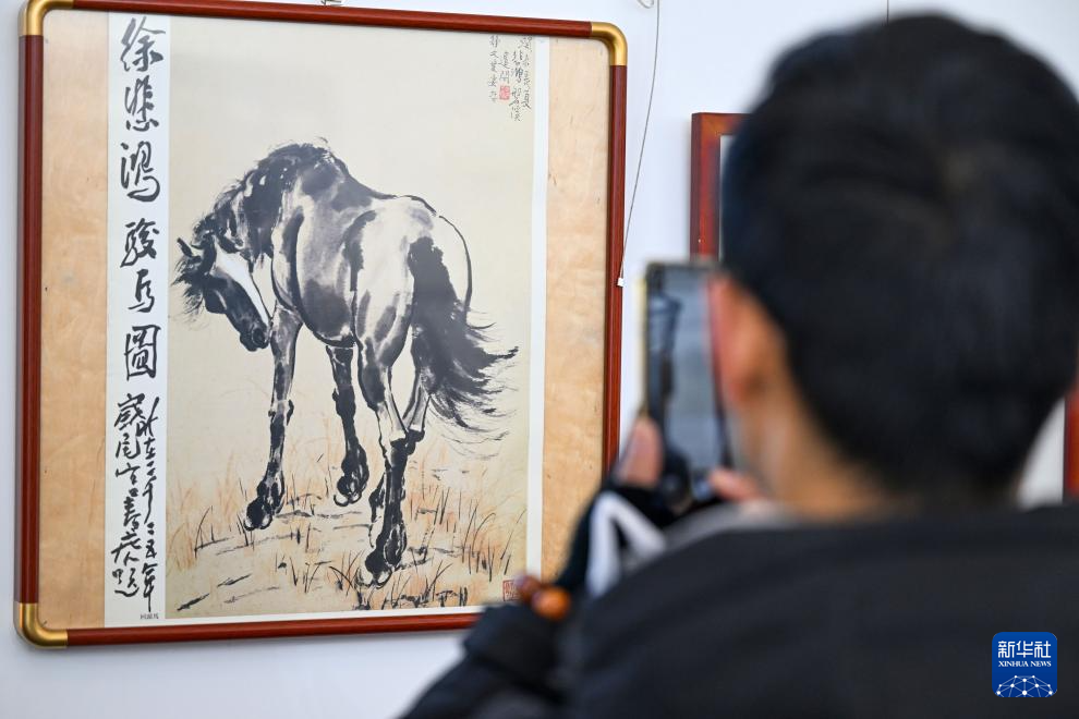 12月29日,参观者在天津古文化街参观“喜迎马年,五代画马人马画艺术展”。