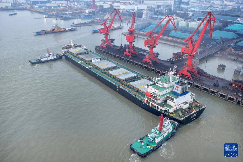 12月29日,南通港一处码头准备卸运电煤(无人机照片)。新华社发(许丛军摄)