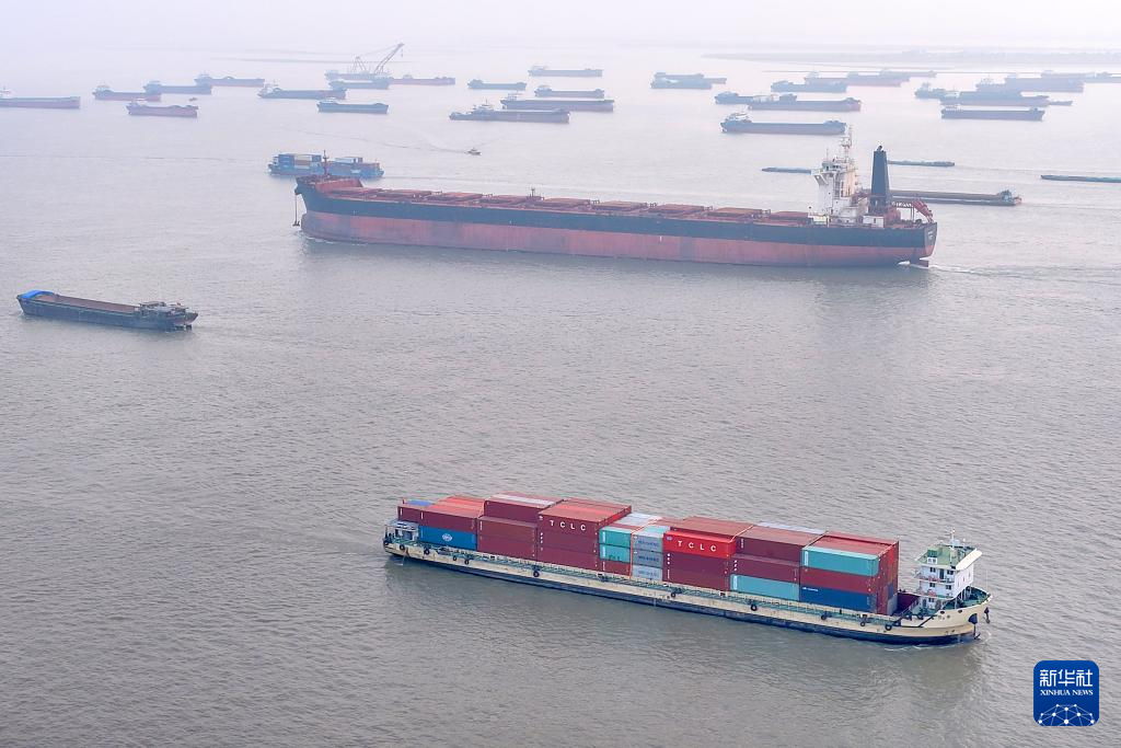 12月29日,集装箱船在长江江苏南通段行驶(无人机照片)。新华社发(许丛军摄)