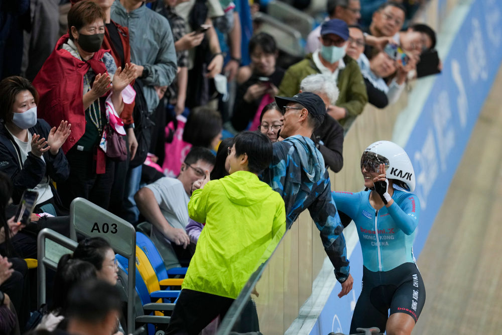 11月17日,香港队选手李思颖在第十五届全运会场地自行车女子全能赛后与观众合影。新华社记者 吴鲁 摄