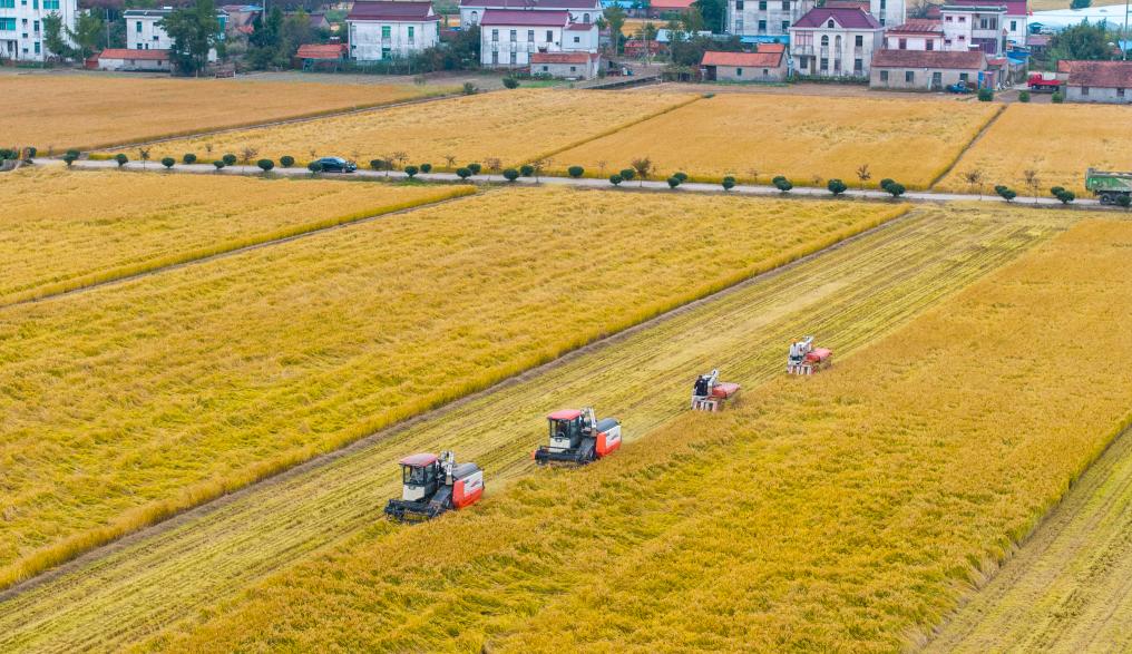 2025年10月30日,在江苏省南通市通州区十总镇育民村高标准农田里,村民驾驶农机收割水稻(无人机照片)。新华社发