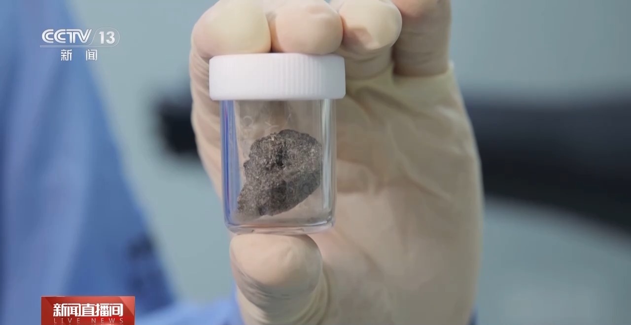 总台央视记者褚尔嘉:现在我手上的就是嫦娥六号采集回的月球样品,它的重量达到了9克左右,它也是迄今为止我们人类从月球背面采集到的最大的一块玄武岩样品。